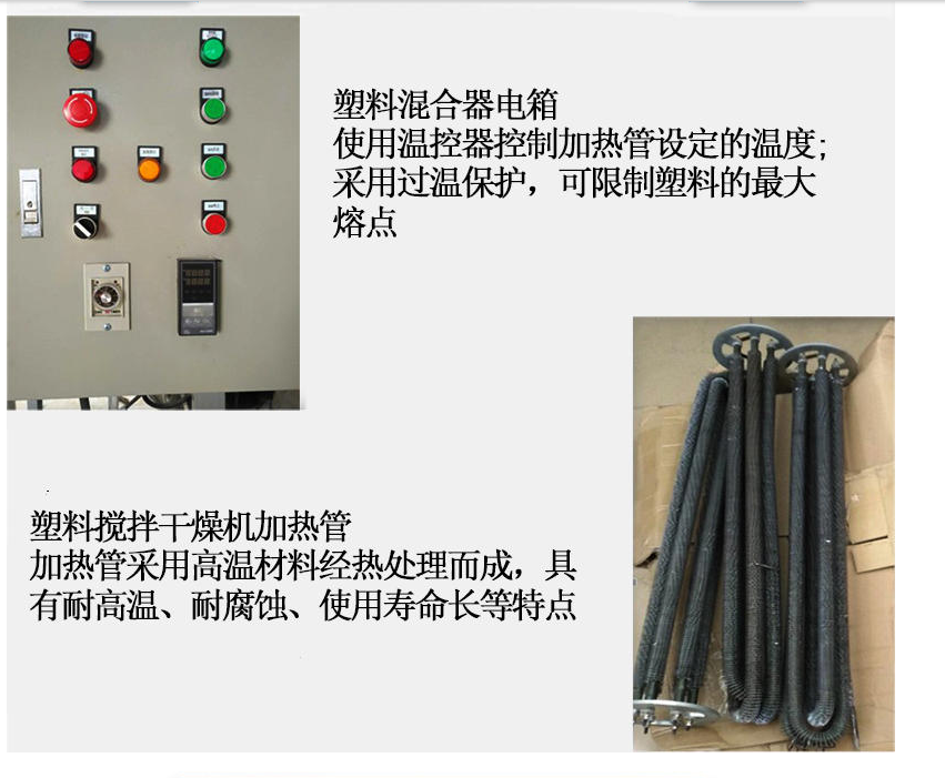 9、由于原料在桶內(nèi)不停的翻滾,熱風(fēng)不停的從中心輸送從而達到混合與干燥的同步進行,節(jié)省時間和能源。如不需干燥,只要關(guān)掉干燥開關(guān),僅使用混合機功能,本機亦適用于粒料與粉碎料、色母粒的混合。